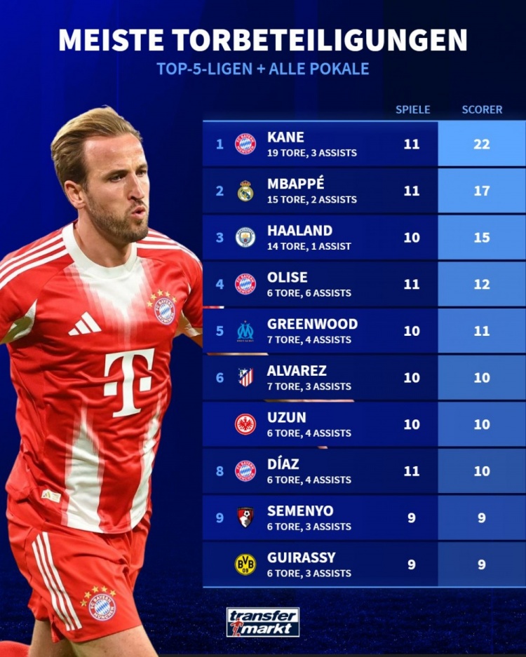 截至10月20日,《转会市场》发布了本赛季五大联赛中球员在俱乐部所有比赛中直接参与进球的统计数据,其中哈里·凯恩、基利安·姆巴佩和埃尔林·哈兰德占据了前三的位置,令人惊叹不已。