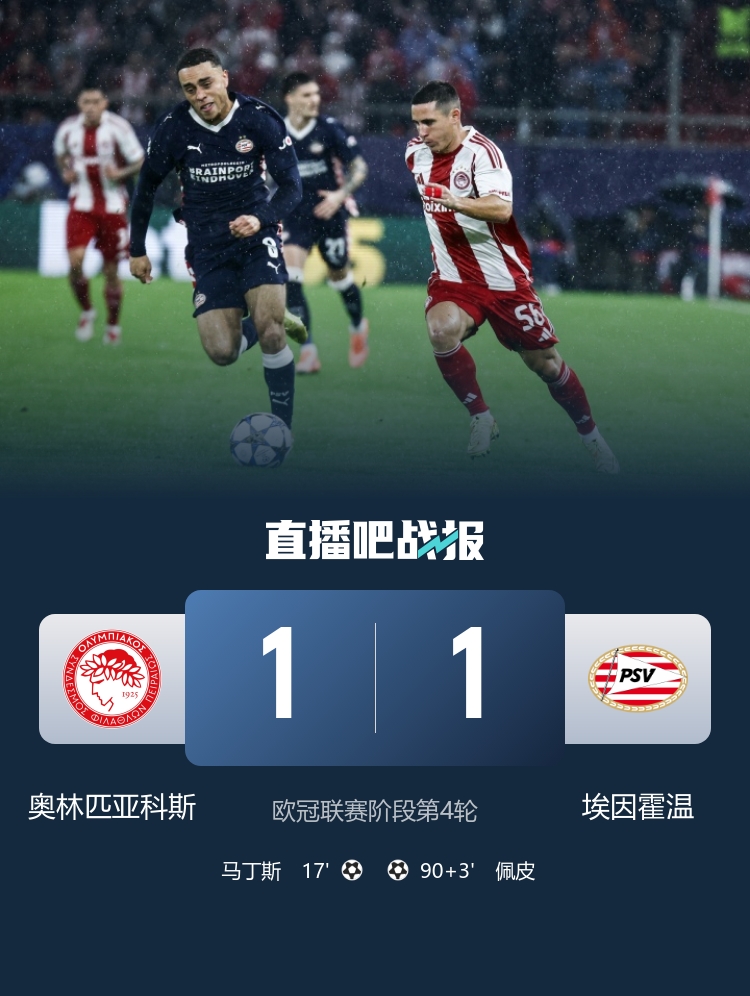 11月5日讯 北京时间今天04:00,欧冠联赛第4轮迎来一场焦点战,奥林匹亚科斯在卡莱斯卡基斯体育场与埃因霍温交锋。比赛走势跌宕起伏,上半场奇奎尼奥在禁区内被放倒但未获判罚。随后的比赛中,奇奎尼奥助攻马丁斯打入精彩进球,帮助奥林匹亚科斯率先取得领先。然而在比赛尾声阶段,埃因霍温的佩皮在补时阶段扳平比分,最终两队以1-1握手言和,奥林匹亚科斯未能获得期待已久的欧冠首胜。