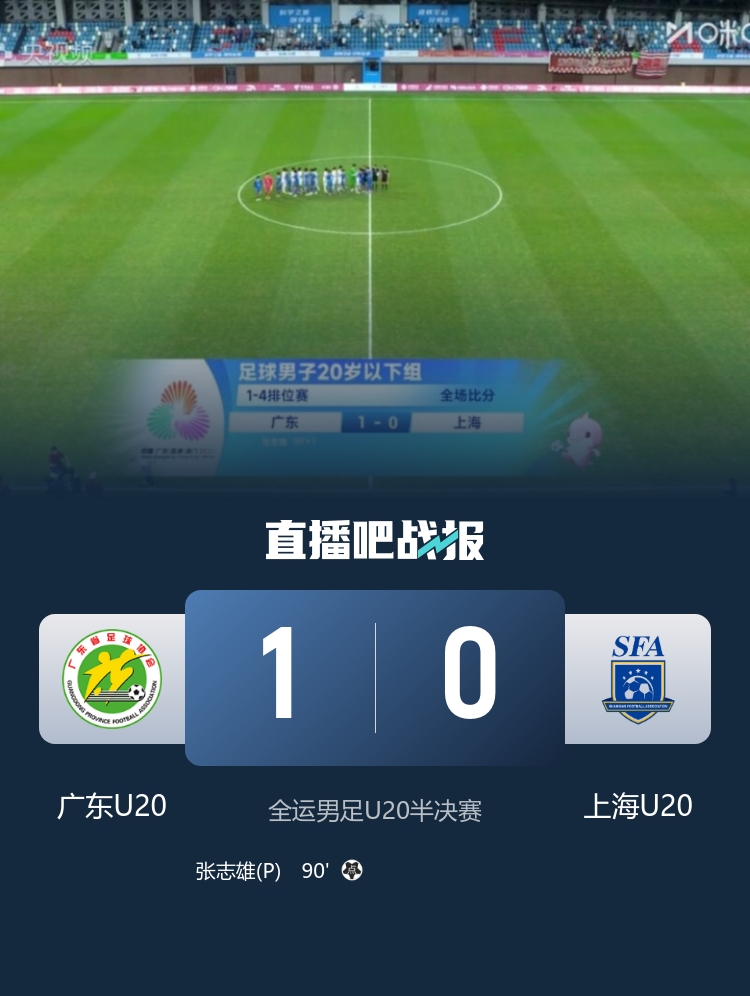 在11月10日进行的全运男足U20半决赛中,广东U20于深圳青少年足球训练基地中心体育场面对上海U20,最终凭借张志雄的点球,以1-0战胜对手,顺利晋级决赛。