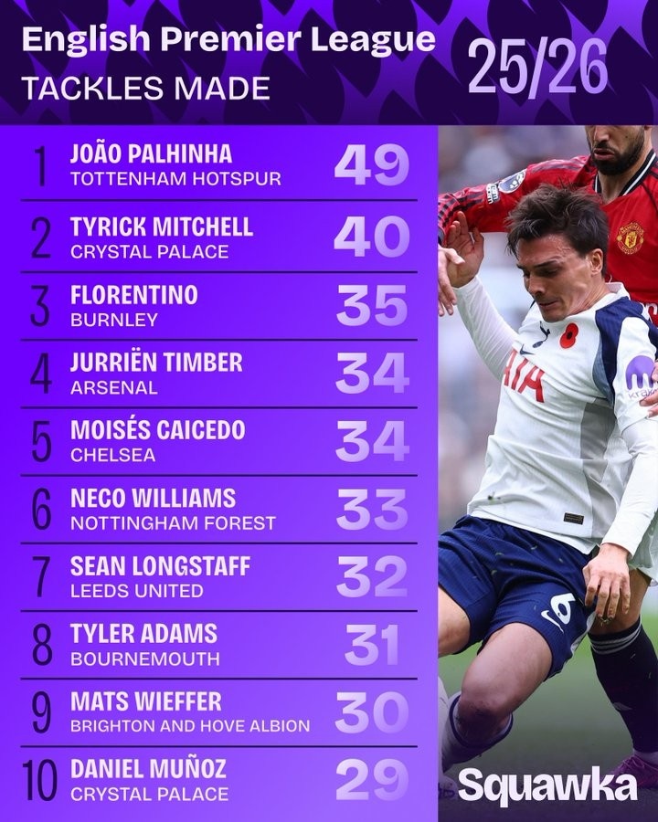 英超联赛如火如荼,经过11轮的角逐,场上的精彩瞬间层出不穷,其中抢断成为了比赛中不可或缺的一部分。根据Squawka的统计,本赛季英超抢断次数排行榜上,来自托特纳姆热刺的若昂·帕利尼亚气势如虹,已完成49次抢断,独占鳌头。