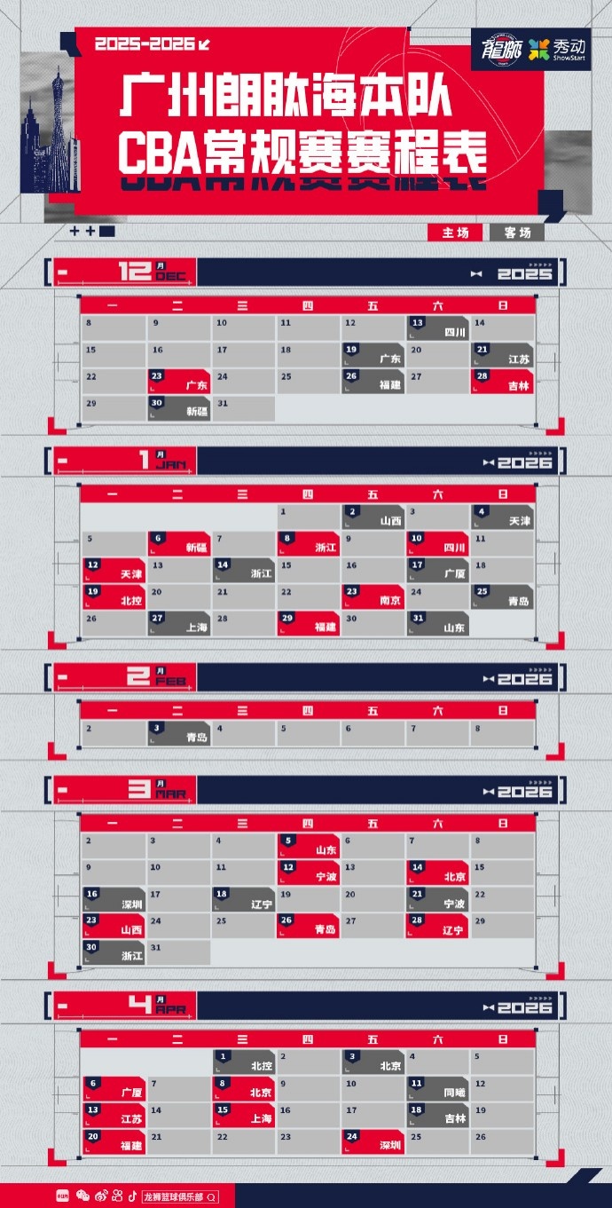 2. 2025年12月19日的常规赛第三轮,龙狮将与广东对阵,而原定于2025年12月23日的第五轮广东与龙狮的交锋,则进行了主客场的调换。