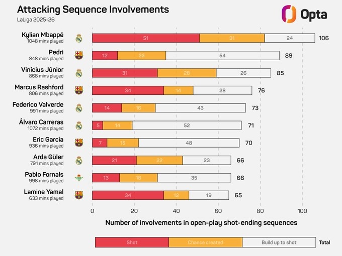 紧随其后的是来自巴萨的佩德里,他本赛季的参与有效进攻次数也相当可观,达到了89次。其中,虽然他的射门仅有12次,但他以23次的机会创造和56次的组织策动作了重要补充,显示出他在球场上的思维和传球能力。