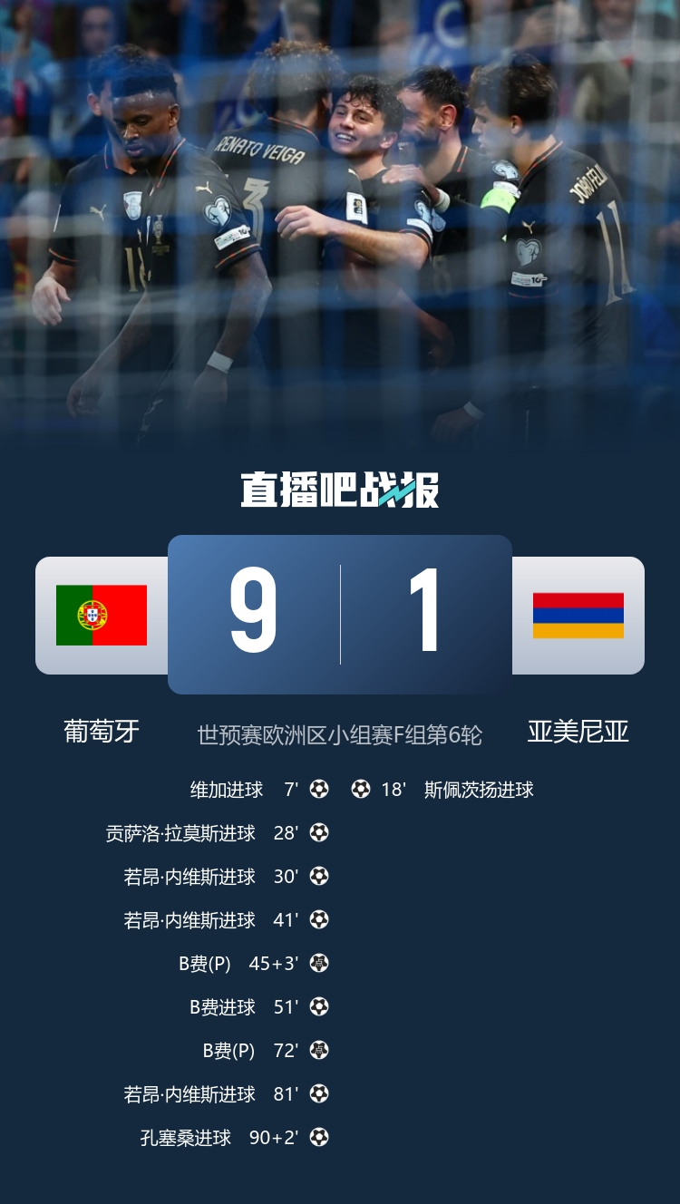 内维斯的任意球直接打入右上死角,令葡萄牙以4-1大幅领先,而在补时阶段,B费主罚的点球更是羸弱的亚美尼亚的防线的终点。下半场时,B费再次表现出色,连续进球让对手毫无还手之力。博尔赫斯制造点球,续写了葡萄牙的进攻盛宴,而若昂·内维斯也是乘势而上,完成帽子戏法。补时阶段,菲利克斯助攻孔塞桑,再次将分数扩大,最终葡萄牙以9-1的悬殊比分大胜亚美尼亚,昂首晋级美加墨世界杯,表现惊艳。