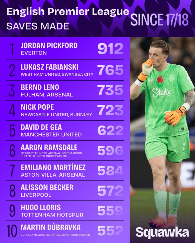 在英超联赛的历史长河中,门将的表现时常成为球队成败的关键。在统计数据显示,自2017-2018赛季至今,皮克福德以912次扑救的优异表现领跑英超门将榜单,映射出他在埃弗顿队中如同铁塔般稳固的防守能力。