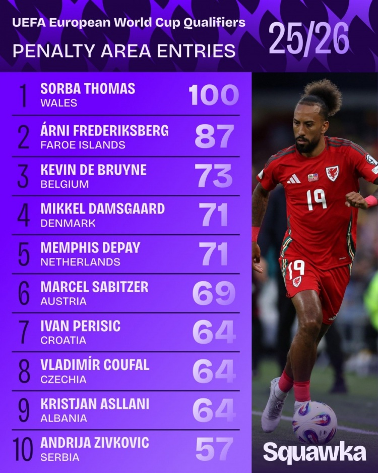 11月20日讯 本届世欧预选赛小组赛阶段已经结束,squakwa对赛事中各球员进入禁区的次数进行了统计,威尔士的边锋索尔巴·托马斯以100次的表现排名榜首。