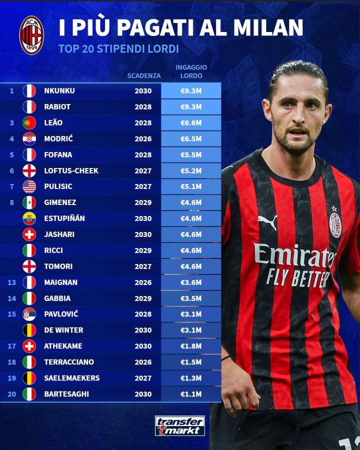 AC米兰队内最新的薪资榜单揭晓,引起了足球界的广泛关注。其中,两位法国新援恩昆库和拉比奥特的年薪高达930万欧元,成为队内薪资的并列最高者,显示出他们在球队中的重要性和被寄予的厚望。