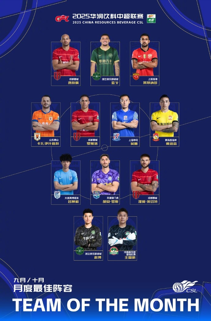 11月27日,中超联赛官方公布了9月和10月的最佳阵容,采用传统的343阵型,其中成都蓉城有三名球员入选。在门将位置上,则有两位表现优异的守门员。