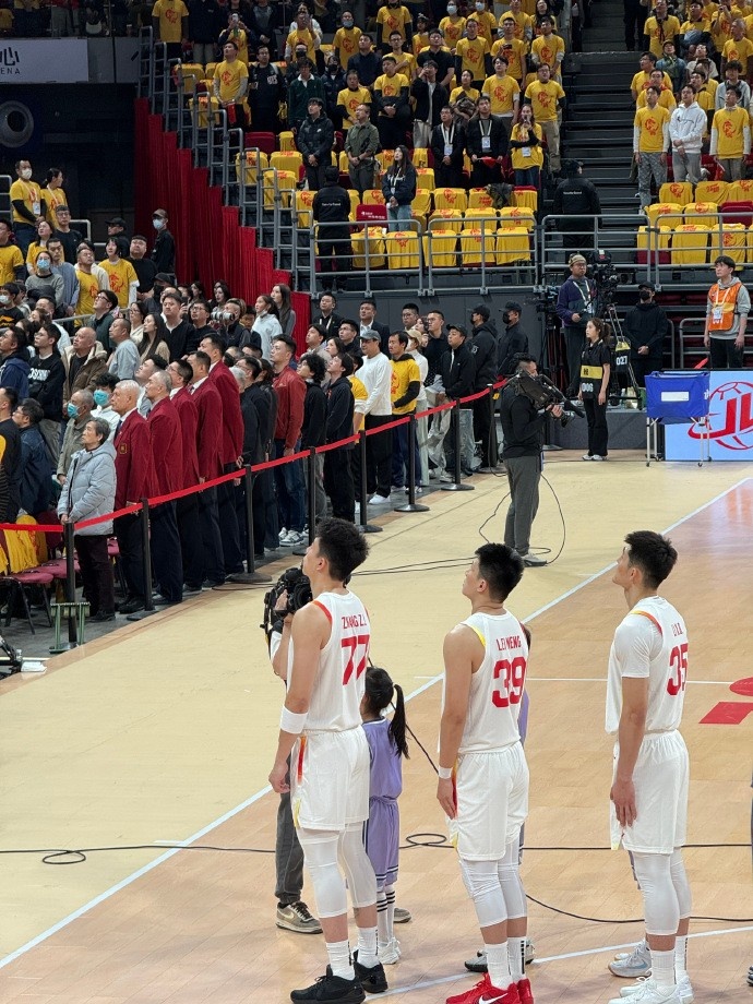 这场比赛,是中国男篮六年来回归故地的象征。在赛前,我捕捉下了一张特别的照片,照片中可以看到男篮的传奇人物如蒋兴权、匡鲁彬、巩晓彬、胡卫东和王治郅,他们在场边为球队加油。五棵松的观众人潮如海浪般涌动,前辈们的支持既是动力,也带来了压力。