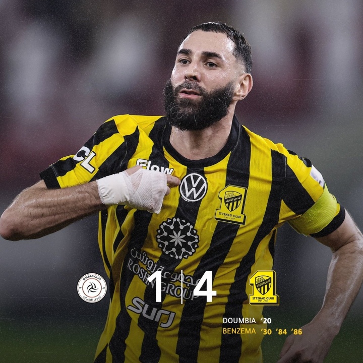本场比赛中,37岁的本泽马表现耀眼,他在第30、84及86分钟内完成了个人的帽子戏法,为球队的胜利立下赫赫战功。这也是本泽马职业生涯中第17次上演帽子戏法,同时也是他加盟吉达联合后第四次完成这一壮举。
