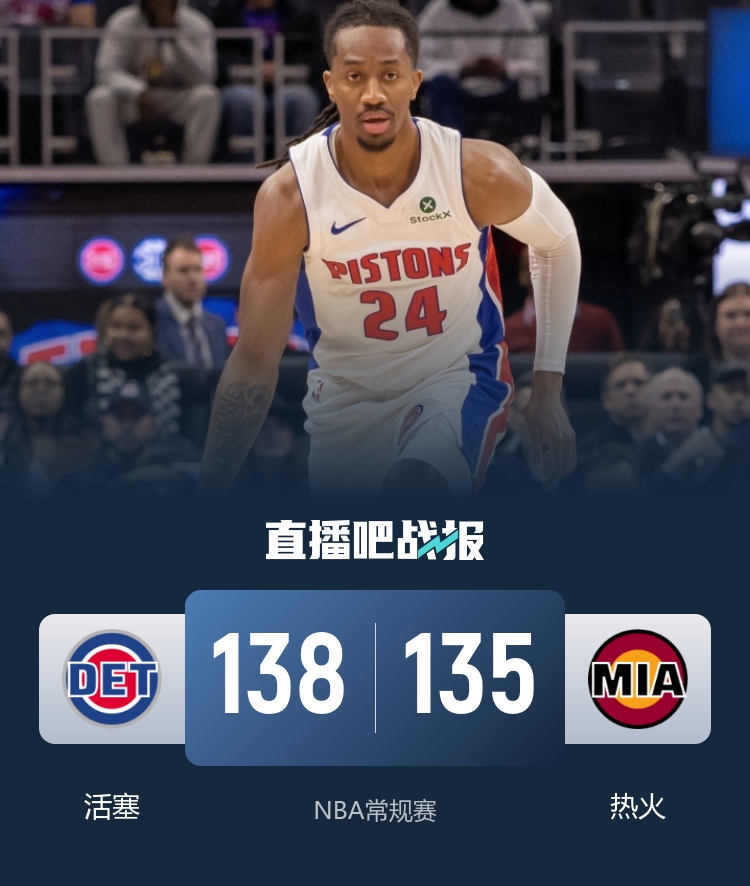 易边再战,两队继续进行对攻,活塞稳扎稳打,逐渐将领先优势扩大。三节结束时,活塞领先17分,最后一节他们一度将分差拉开至20分之多。面对困境,热火奋起直追,打出一波13-0,但詹金斯的关键上篮为活塞止血,康宁汉姆则在攻防两端表现出色,确保比赛胜利。最终,活塞以138-135战胜热火,结束连败的同时也终结了热火的六连胜。