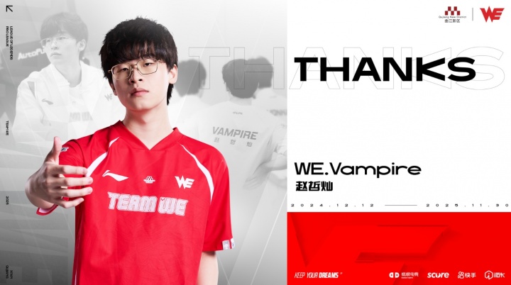 11月30日讯,WE俱乐部正式宣布,辅助选手Vampire将断开连接,恢复为自由选手身份。