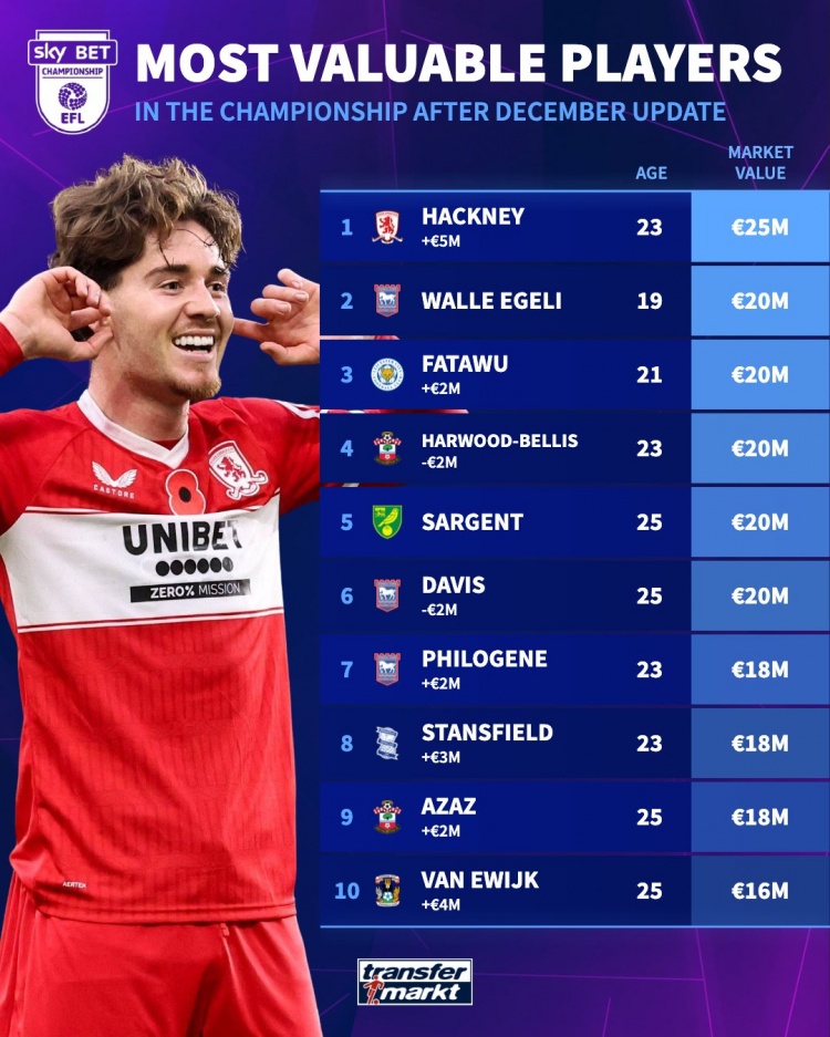 在12月3日的转会市场更新中,英冠的身价排名被洗牌了,各大俱乐部的球员们,这次不是因为场上的表现火爆而曝红,而是因为身价纷纷被重新评估。从这个排名来看,米德尔斯堡的希顿·赫根尼以2500万欧元的身价高居榜首,看起来这位球员的身价比许多球队的整体预算还多,简直是“皇帝的新装”!