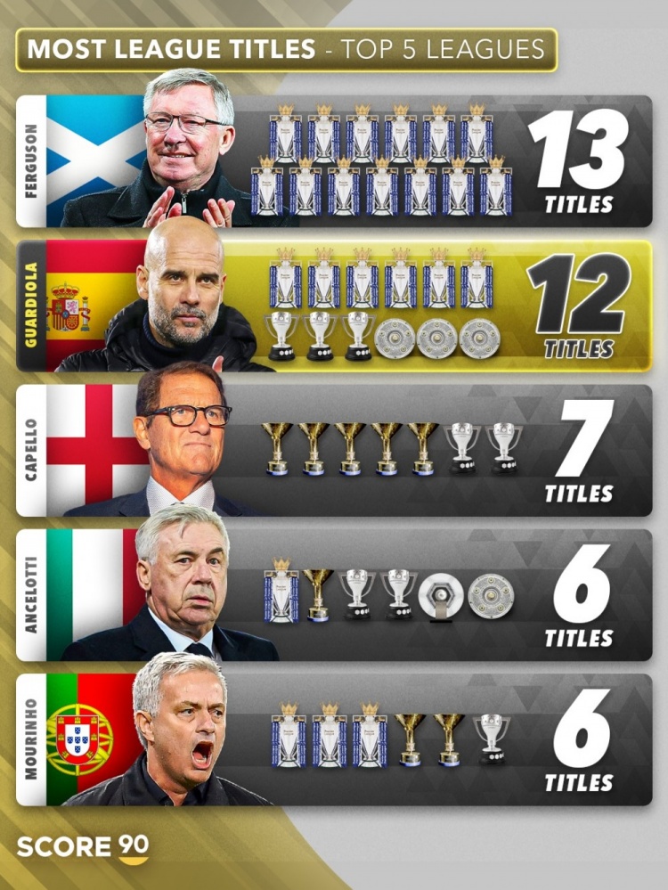 在1990年以来的欧洲五大联赛中,各位执教名将的冠军数量排名依次为: