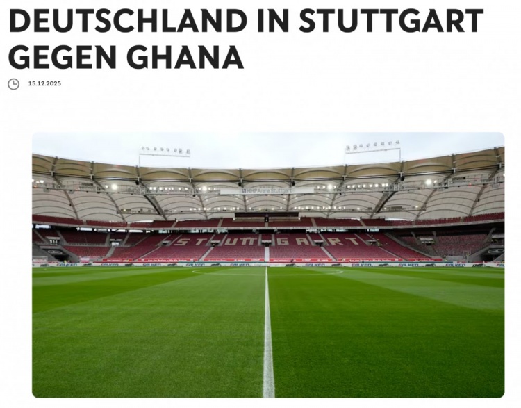 官方宣布,德国队将在2026年3月30日欧洲中部时间晚上8点45(北京时间31日凌晨2点45)于斯图加特迎战加纳队。最初,德国队的友谊赛对手是科特迪瓦,但由于两队在世界杯小组赛抽签中被分到同一小组,因此进行了调整。