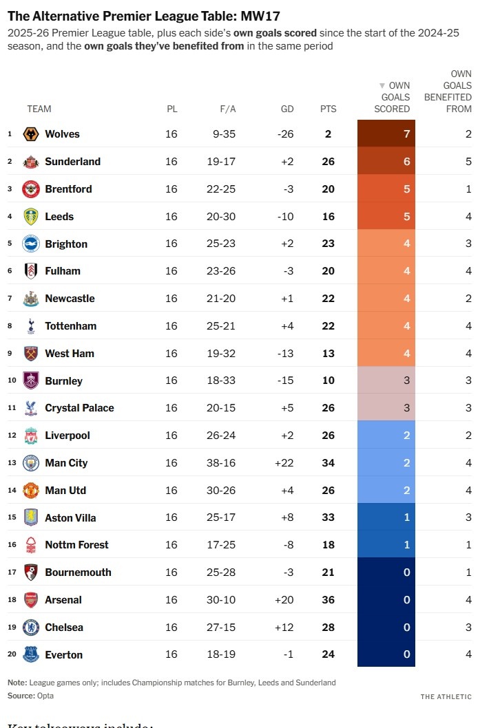 TA独具慧眼,整理了一份英超乌龙球的另类积分榜,特别提到自上赛季以来各队的乌龙球表现(连同竞争对手那些“精彩”的自摆乌龙)。桑德兰、伯恩利和利兹联的数据来自上赛季的英冠,看来在下级联赛练就了绝佳的“乌龙”本领。