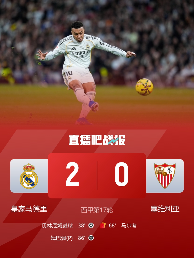 在2025-26赛季西甲联赛第17轮的比赛中,皇马在自己的主场伯纳乌迎战了劲敌塞维利亚。这场比赛的开局紧张而激烈,双方的球员都展现了为了胜利而拼搏的决心。上半场,尽管弗兰·加西亚和伊萨克·罗梅罗曾有绝佳的单刀机会,但均未能把握住,幸运之神最终眷顾了皇马——在第38分钟,贝林厄姆高高跃起,以一记漂亮的头球攻门,为皇马首开纪录,1-0领先。