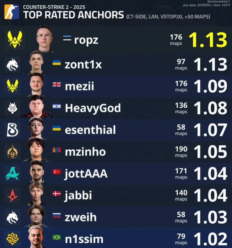 在刚刚发布的“COUNTER-STRIKE 2 - 2025”赛季统计中,根据来自statsmeister1与NER0cs共同整理的数据,选手ropz表现优异,以1.13的评分高居榜首。这项统计针对的是CT方(防守方)在高水平线下比赛中,特别是在与世界前20强球队交锋、并且比赛地图数量超过50张的情况下,评选出的一流防守选手(TOP RATED ANCHORS)。