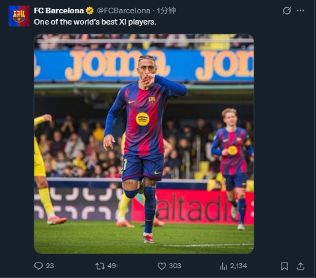 在西甲第17轮的较量中,巴萨以2-0击败了黄潜,拉菲尼亚再一次成为比赛的焦点。他在比赛中制造了一次点球机会,并亲自操刀将其罚进,为球队贡献了重要的进球。赛后,巴萨的官方社交媒体分享了拉菲尼亚在比赛中的精彩瞬间,并赞扬他是“世界上最好的11名球员之一”。