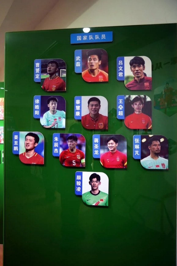 过去,荣誉室的展板上只展示了武磊、张琳芃等少数几位球员的照片,排列方式也相对简单。如今,展板上的11位球员则以一支首发队伍的形式展示,显然是经过精心挑选,体现了徐根宝培养的优秀“崇明子弟兵”中的最佳阵容。