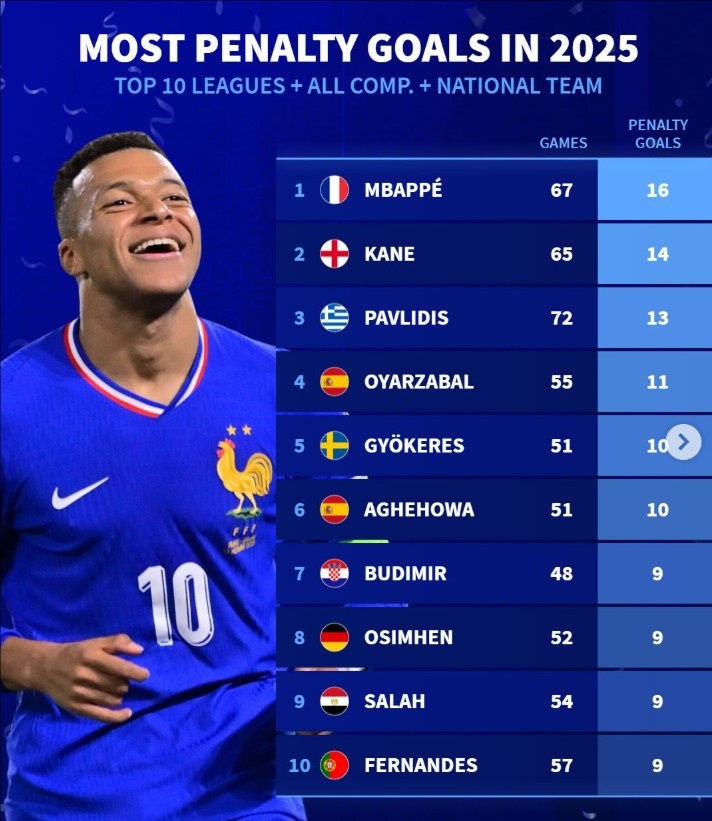 根据德转的统计数据,2025年点球进球数的排行榜赫然出炉,揭示了各位球员在此特定领域的出色表现。排名首位的是法国籍前锋姆巴佩,他在皇马效力期间,参与了67场比赛,并成功罚入16粒点球,展现了他在关键时刻的冷静与精准。