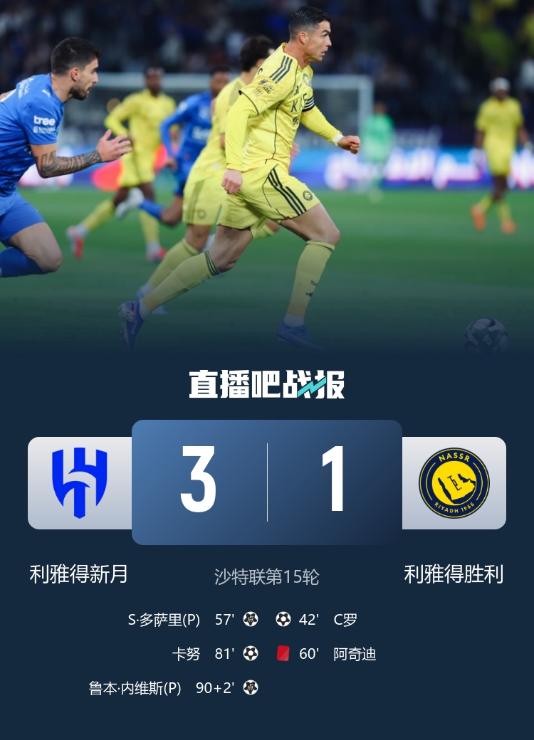 终场前的89分钟,比赛的最后时刻再起波澜。米林科维奇的直塞打破了防线,多萨里再度创造出机遇,被哈桑铲倒,裁判再次指向点球点,内维斯没有辜负机会,稳稳将球送入网窝,最终利雅得新月以3-1的比分锁定胜局。三连败的利雅得胜利,对榜首的距离拉大到了7分,面临着前所未有的压力。