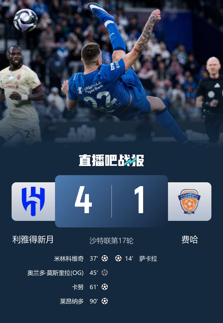 下半场再看,两名球员的表现让人不禁想叹息,卡努高高跃起,像一只雄鹰一般顶入球队第三球,这恍若是在告诉费哈,“我们已经不在同一水平”。而在比赛最后时刻,内维斯再次证明了自己的价值,两次助攻,梅开二度,帮助莱昂纳多锁定胜局,最终比分定格在4-1。新月在主场豪取13连胜,继续以44分高居榜首,领先第二名胜利7分,简直像是在这条联赛上飞驰,谁敢上前挑战?