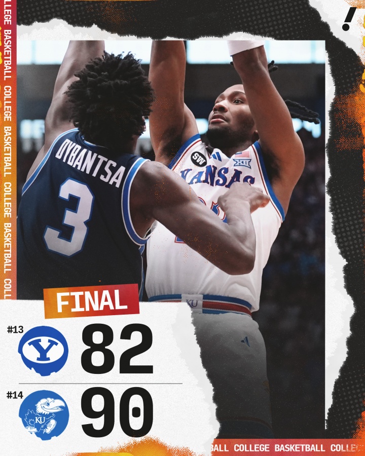 在这场备受瞩目的NCAA常规赛中,堪萨斯大学在主场以90-82令人振奋地击败了杨百翰大学,迎来了五连胜的辉煌时刻。比赛吸引了众多NBA高层的关注,马刺总经理布莱恩·赖特、雷霆总经理兼执行副总裁普雷斯蒂、篮网总经理肖恩·马克斯,以及步行者总裁凯文·普理查德皆亲临现场,目睹这场未来星光的对决。