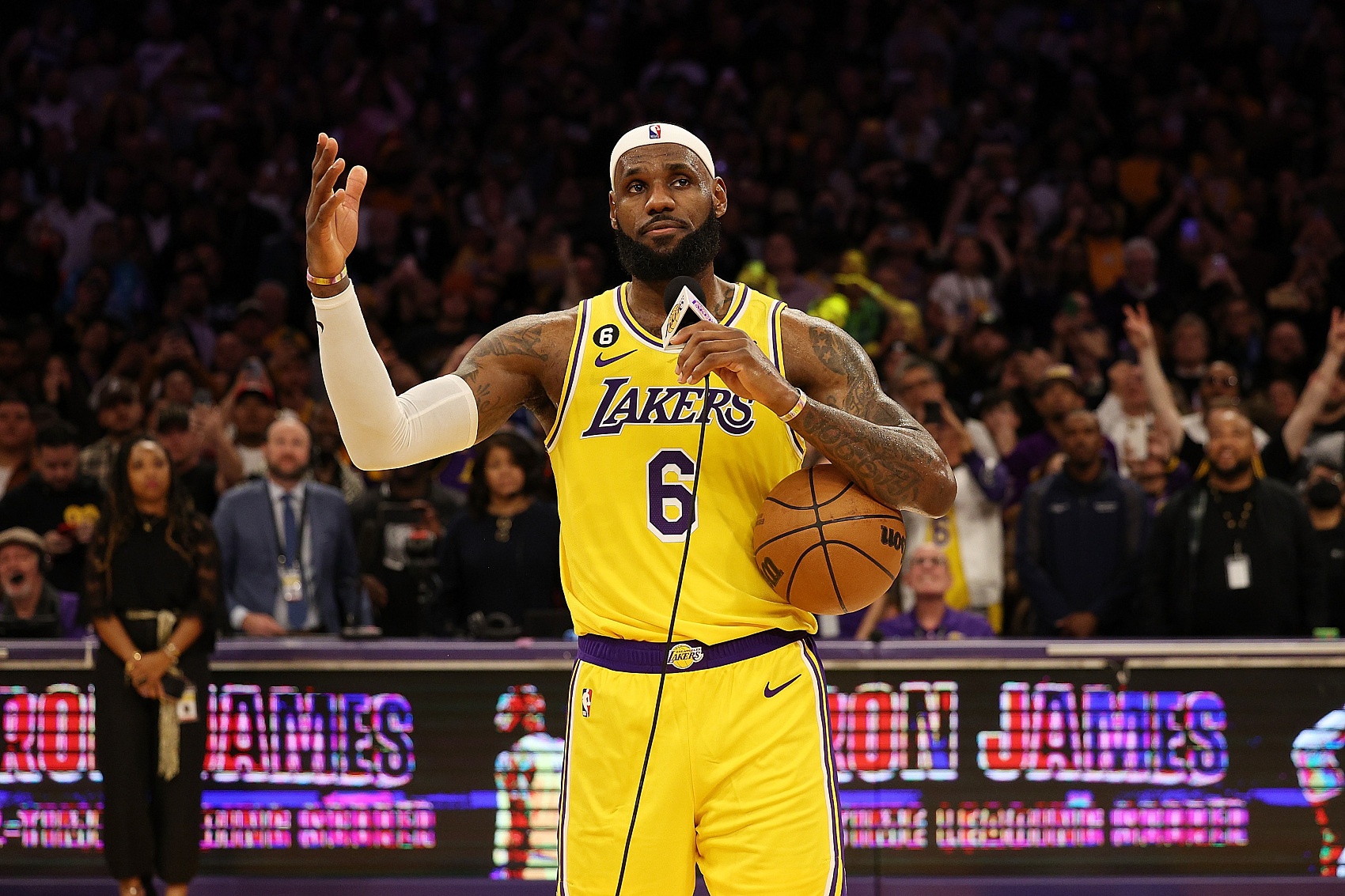 在那场比赛的第三节,詹姆斯的一个后仰跳投让他的总得分达到了38388分,成功越过了贾巴尔的38387分,正式成为得分历史第一人。这个历史时刻发生后,詹姆斯双臂高举,场边官方宣布暂停,以此庆祝他的这一伟大成就。贾巴尔也在现场自豪地举起比赛用球,并亲手将其递交给詹姆斯,以象征得分王荣誉的传递。