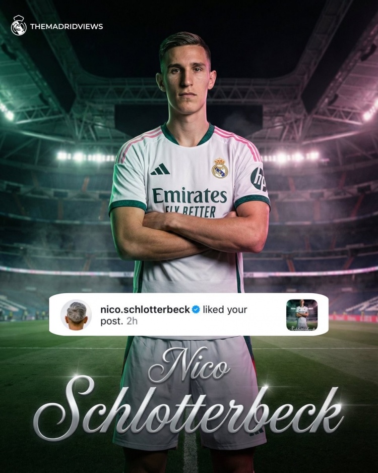 在这条动态中,博主还贴出了施洛特贝克身穿皇马球衣的合成图片,令人遐想。他也指出,施洛特贝克本人对这条帖子进行了点赞,这在某种程度上印证了他希望下赛季能够加盟皇马的消息。从博主的角度来看,这个“点赞”可以被视为对这笔转会的一种默许。