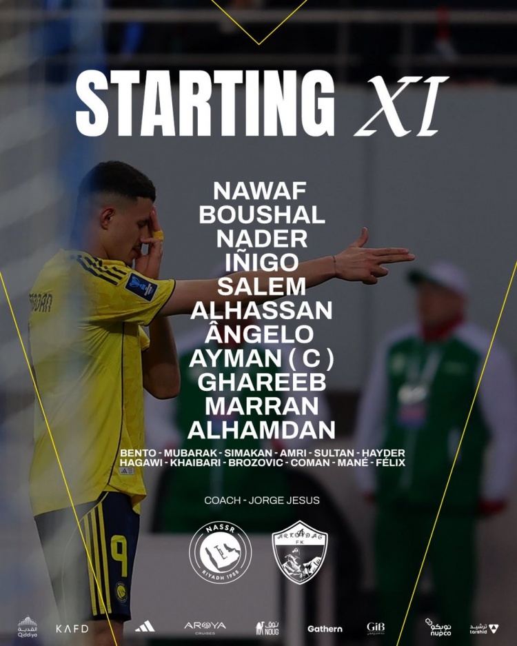 利雅得胜利的首发阵容为:门将纳瓦夫·阿奇迪,后卫包括纳瓦夫·布沙勒、纳德尔·沙里、伊尼戈·马丁内斯和萨勒姆·纳吉迪。中场方面有阿里·哈桑、安吉洛、艾曼·叶海亚,前锋则是加里卜、穆罕默德·马兰和哈姆丹。