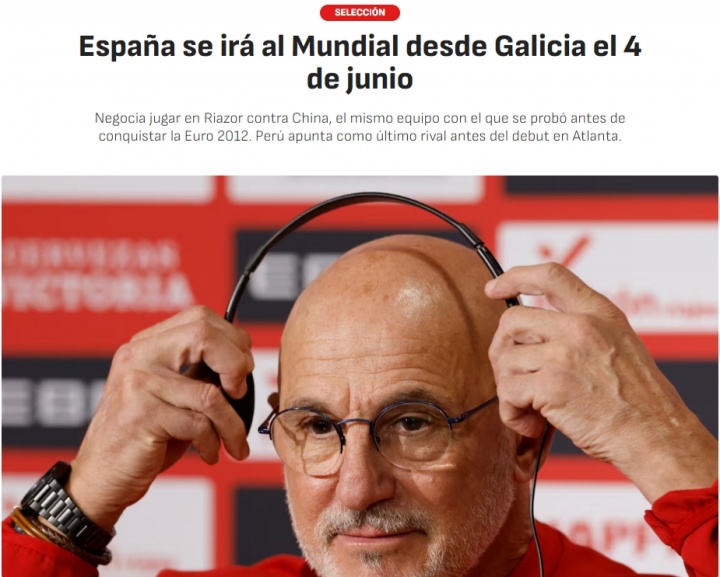 根据《阿斯报》的透露,西班牙队计划在6月4日于位于拉科鲁尼亚的里亚索尔球场举行本土最后一场热身赛,届时对手将是中国队。赛后,西班牙队将启程前往美洲,准备对接下来的美加墨世界杯。在世界杯举办地,西班牙还会进行另一次热身赛,对手很可能是来自南美的秘鲁队。