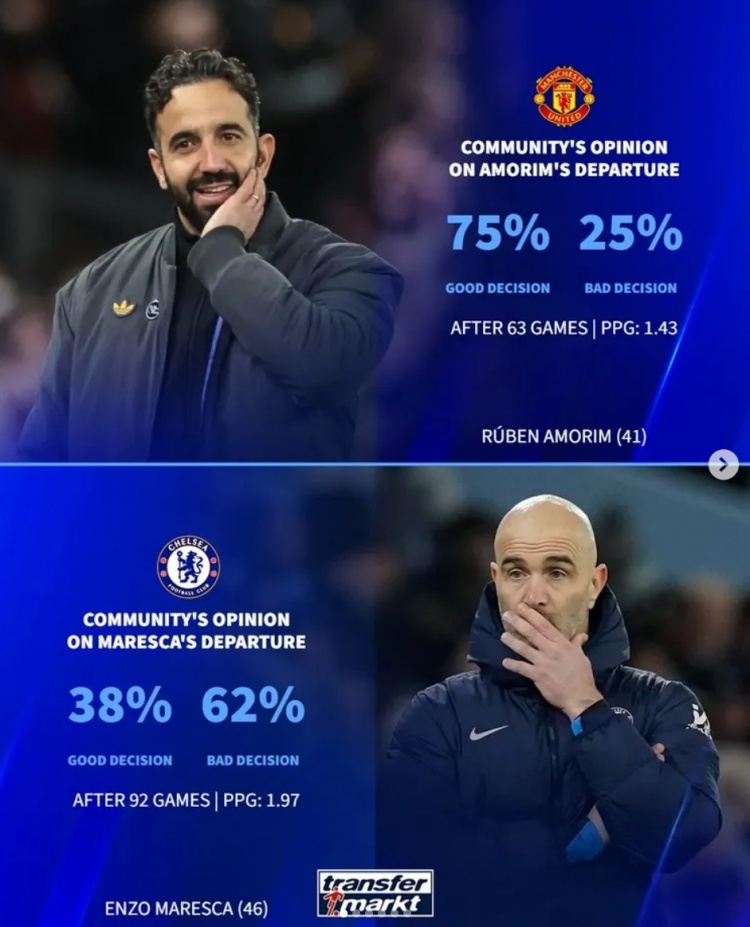 在曼联的阿莫林执教下,他带领球队进行了63场比赛,场均取得1.43分,拥有75%的球迷支持率,反对者占25%。切尔西的马雷斯卡则面对更多争议,他在92场比赛中场均取得1.97分,但仅有38%的球迷支持他,反对者高达62%。