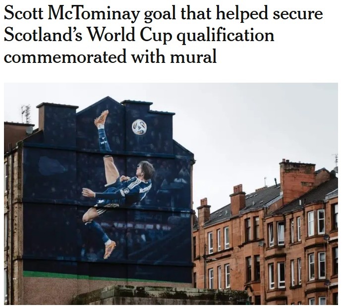 在足球的历史长河中,总有那些久违的荣耀瞬间,犹如璀璨星辰,闪耀在我们的记忆中。近日,麦克托米奈在战胜丹麦的比赛中那记令人惊叹的倒钩进球,再次被铭刻在库尔特公园球场外的壁画上,以此来纪念苏格兰时隔28年重返世界杯的辉煌时刻。