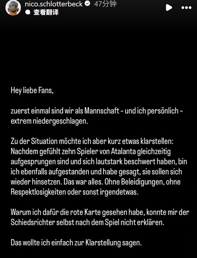 赛后,施洛特贝克在社交媒体上发声,表露了他对这一判罚的质疑。他开头对球迷表达了自己的情感:“亲爱的朋友们,大家好!首先,我想说我们全队,包括我自己,都感到极度沮丧。”