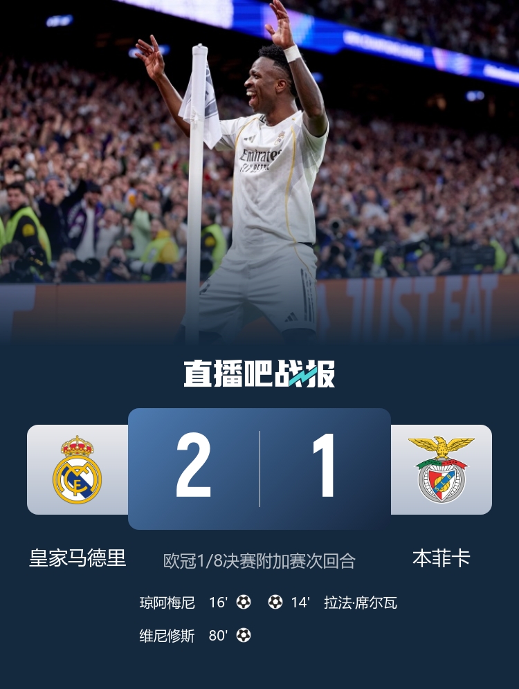 进入下半场,拉法·席尔瓦的远射击中横梁,未能为本菲卡再添胜绩。随即,皇家马德里的巴尔韦德助攻维尼修斯,再次让主队取得领先。全场最终,皇家马德里以2-1战胜本菲卡,凭借总比分3-1顺利晋级16强,将在下一轮面对葡萄牙体育或曼城。