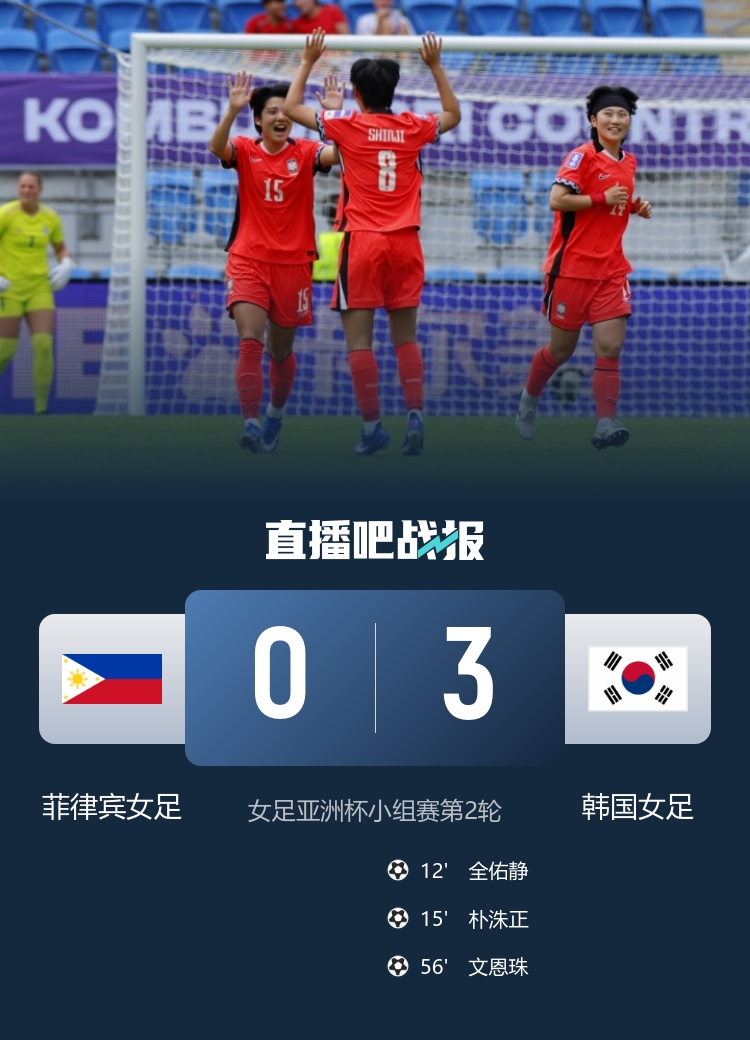 在3月5日的女足亚洲杯小组赛第二轮中,韩国女足以3-0的辉煌战绩战胜了菲律宾女足,标志着她们在小组赛中取得了连续两场胜利,两个比赛打进6球,状态火热!