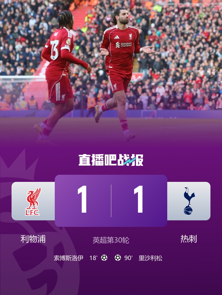 在2025-26赛季英超联赛第30轮的较量中,利物浦在安菲尔德球场迎战热刺,比赛于北京时间3月16日凌晨0:30开始。首节战况可谓波澜迭起,利物浦凭借索博斯洛伊的出色表现在上半场取得了1-0的领先。然而,比赛的走向在下半场发生了戏剧性的转变,最终双方以1-1握手言和,利物浦的积分也来到了49分,暂时升至积分榜第5位。