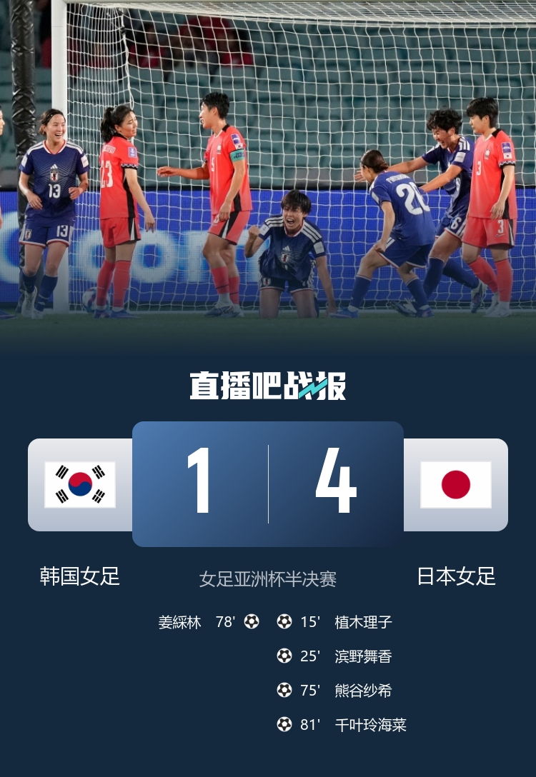 在3月18日的女足亚洲杯半决赛中,日本女足以4-1战胜韩国女足,成功晋级决赛。比赛于雅高体育场进行,尽管韩国女足在主场作战,但始终未能掌控局面。