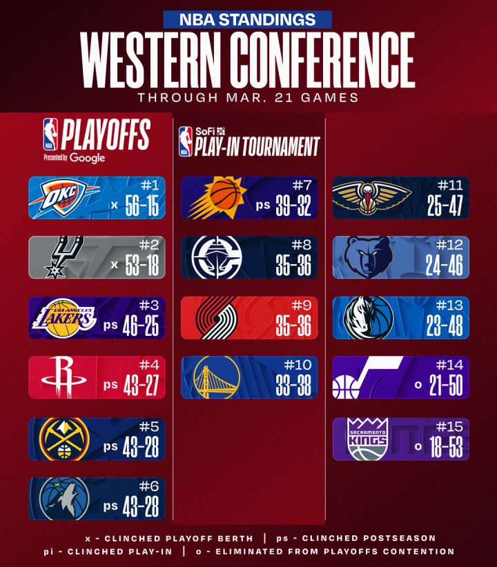 随着NBA常规赛的帷幕落下,各支球队的表现也逐渐明朗,西部排名随之更新。让我们细细品味这场激烈的竞技盛宴。