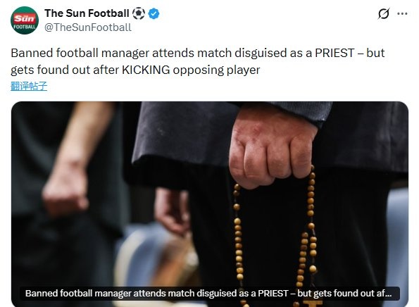 3月23日讯 根据《太阳报》的消息,意大利发生了一起令人瞩目的足球事件。一位被禁赛的教练为了现场指挥比赛,竟然伪装成神父混入了球场。这位教练的疯狂举动在他冲入场内踢打对方球员时完全暴露了。