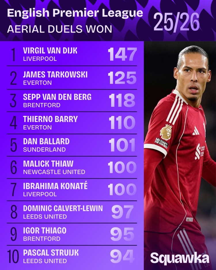 在本赛季英超联赛中,关于球员在争顶方面的表现,Squawka进行了详细统计,结果显示,利物浦的范戴克以147次成功争顶排名第一,且他的成功率高达75.77%,在所有争顶超过100次的球员中位居首位。
