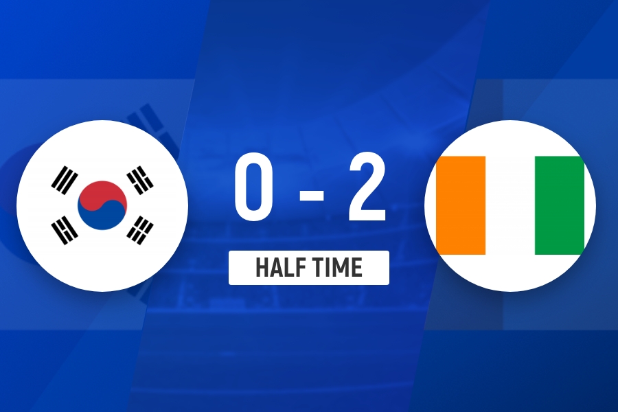 上半场结束前,经过3分钟的伤停补时,双方以韩国0-2科特迪瓦的比分进入更衣室。