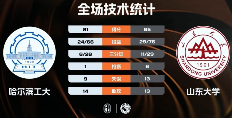 进入最后的决战阶段,双方频频进攻却都未能得分,场上局势变得愈发紧张。聂宸彬和冯俊畇的三分球为山东大学注入了强心剂,而李泽诚则通过一记关键上篮将分差缩小至1分。尽管张为在罚球线上表现出色,稳稳将领先优势扩大至5分,但龚安的三分虽试图续命,却未能奏效。最终,山东大学以85-81的小分差险胜哈工大,赢得了这场悬念迭起的比赛。