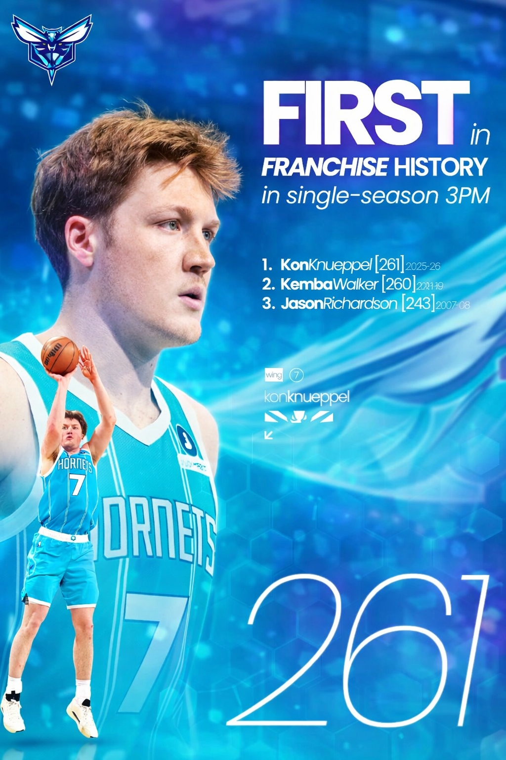 在NBA常规赛中,黄蜂队在主场迎战太阳队。比赛进入第四节时,黄蜂的新秀克尼佩尔投中了他本场比赛的第四记三分球,因此本赛季的三分命中总数达到了261记,这一表现创造了黄蜂队史单赛季的三分球纪录,超越了之前由肯巴·沃克保持的260记(2018-19赛季)。