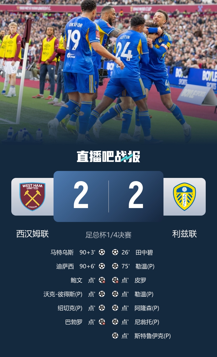 在如临大敌的点球决战中,利兹联的佩利如同一名勇士,毅然扑出了对方的点球,帮助球队逐步掌控局势。终场前的最后一击,斯特鲁伊克稳稳罚入制胜一球,最终利兹联以6-4的总比分淘汰西汉姆联,昂首晋级四强。